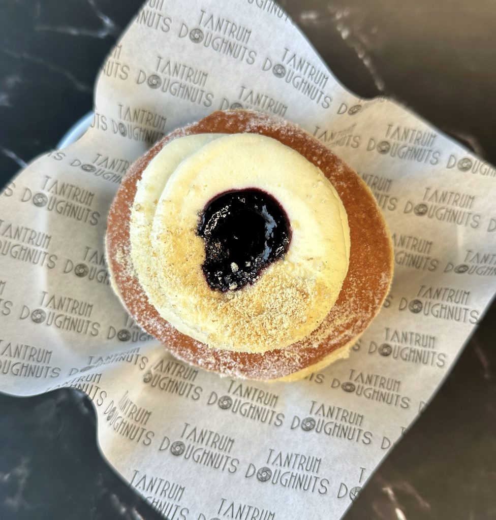 Brioche doughnut filled with blueberry jam, topped with cheesecake frosting and crumble.