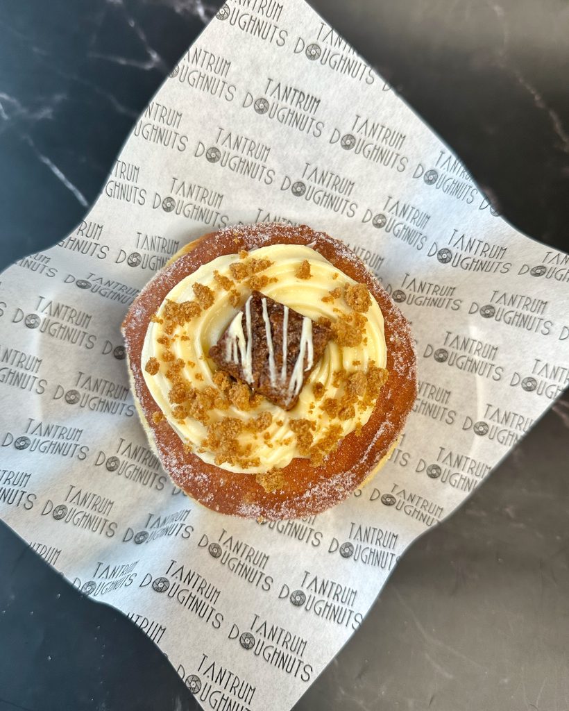 Brioche doughnut filled with a butterscotch Baileys custard, topped with Biscoff cheesecake frosting & white chocolate blondie. Contains alcohol.