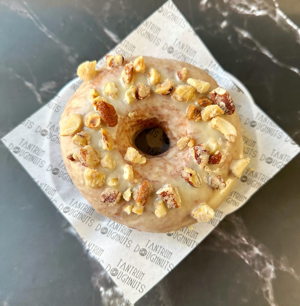 Brioche ring doughnut dipped in a treacle & cardamom glaze topped with candied nut brittle.