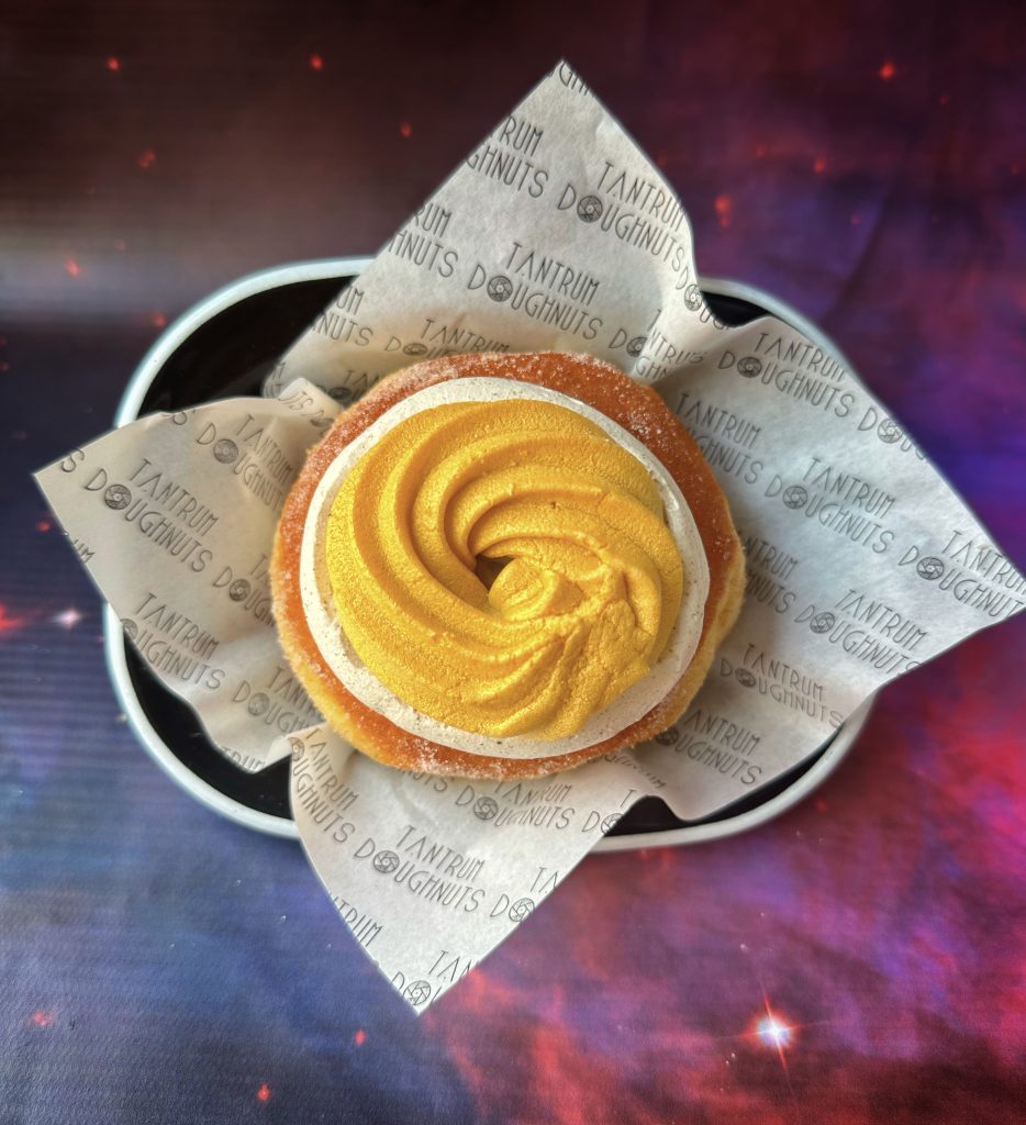 Star Wars Special-Brioche doughnut rolled in cinnamon sugar, filled with Chai spiced custard topped with chai spiced cream & golden shortbread swirl.