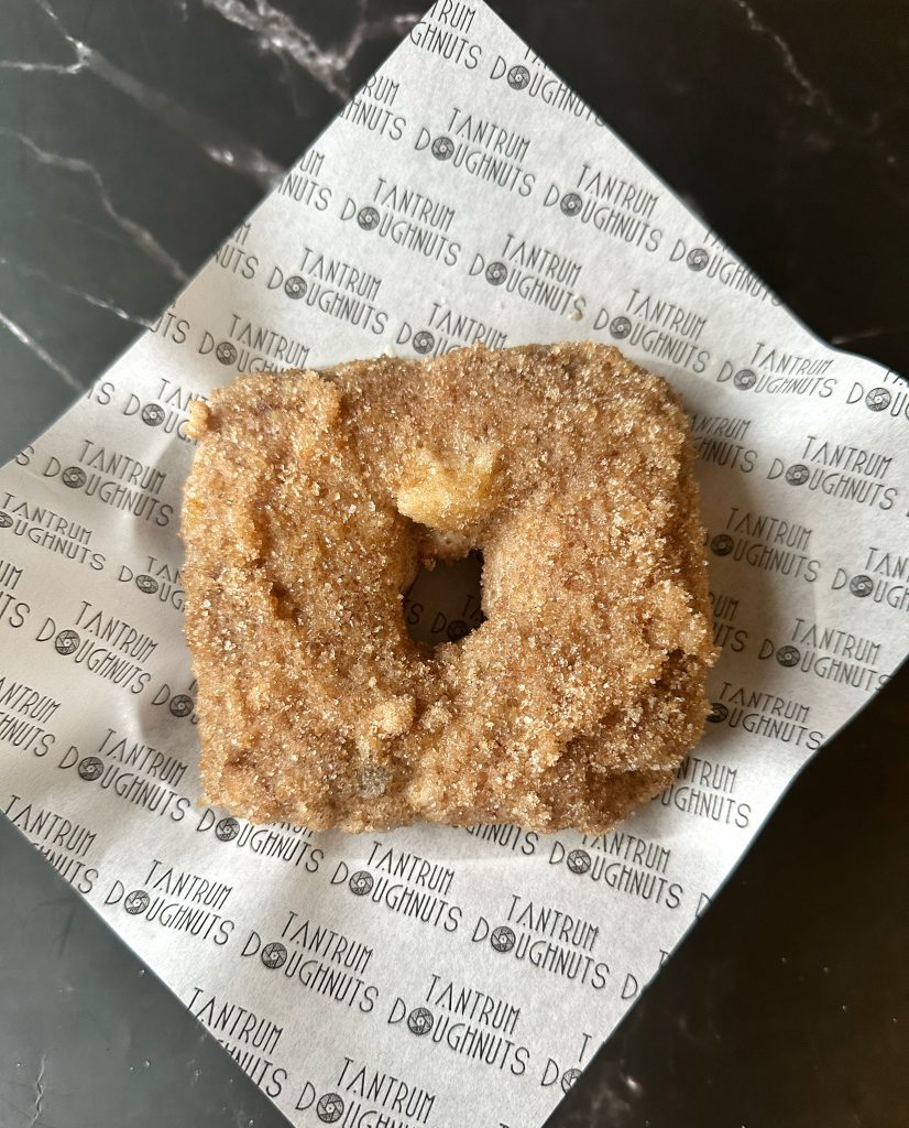 Dense ‘old fashioned’ cake style doughnut with mince pie through the dough, with a mince pie and marmalade glaze dipped in cinnamon sugar.