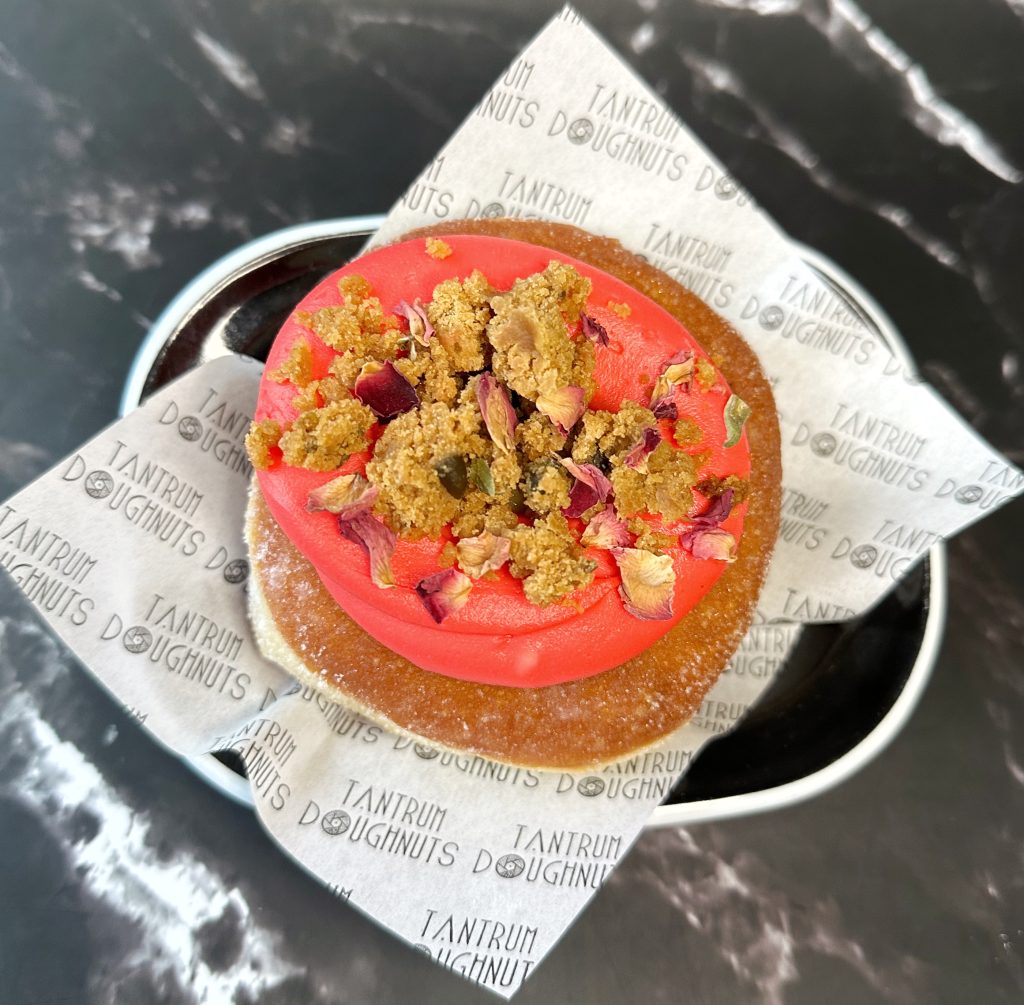 Brioche doughnut filled with a pistachio custard, topped with rosewater buttercream frosting, Persian love cake crumb & dried rose petals.