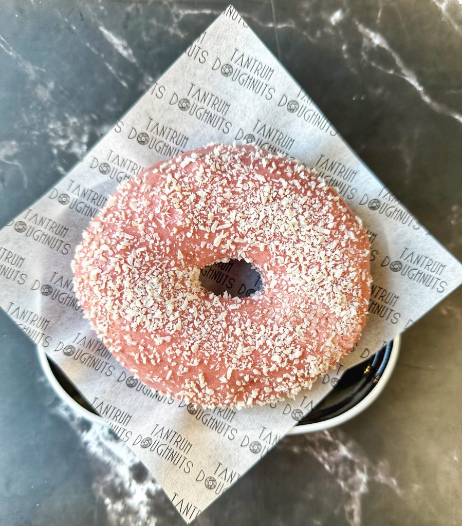 Rhubarb, Cherry & Coconut glazed vegan ring, topped with dessicated coconut and white chocolate sprinkles.
