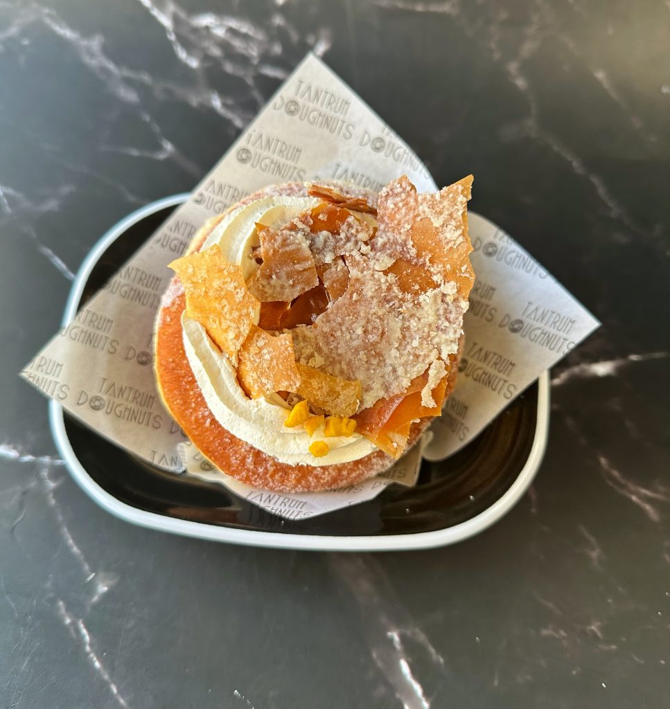 Brioche doughnut filled with a tropical curd & coconut custard. Topped with cream & filo pastry shards.