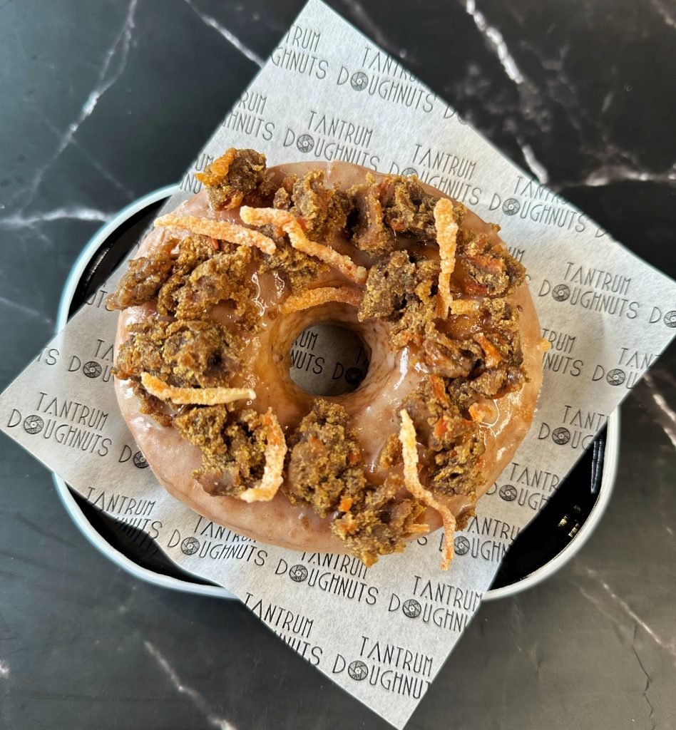 Vegan ring doughnut with a maple glaze, topped with carrot cake pieces & candied carrot.