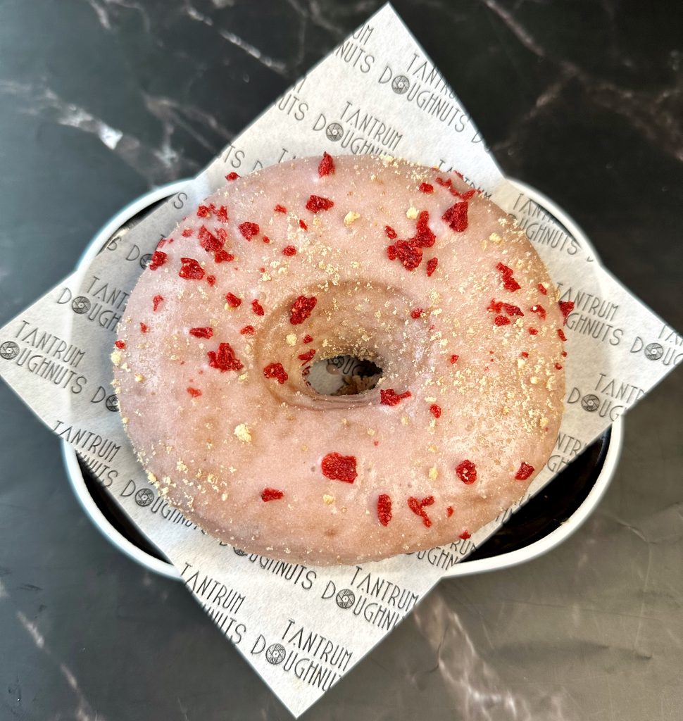 Strawberry glazed Vegan ring topped with a digestive biscuit crumble and strawberry pieces.